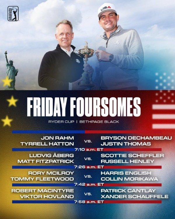 北京时间9月26日,2025年莱德杯将于北京时间今晚19:10在美国纽约贝斯佩奇黑球场正式开赛,首日上午的四人两球赛对阵已经公布。琼-拉姆和泰瑞尔-哈顿两位LI ...